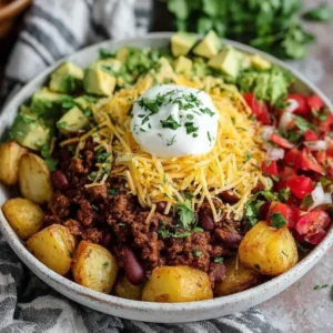 Imagine digging into a bowl layered with crispy roasted potatoes, savory taco meat, and vibrant toppings, all while enjoying the laughter of loved ones around you. This is one you’ll definitely want to pin for later!